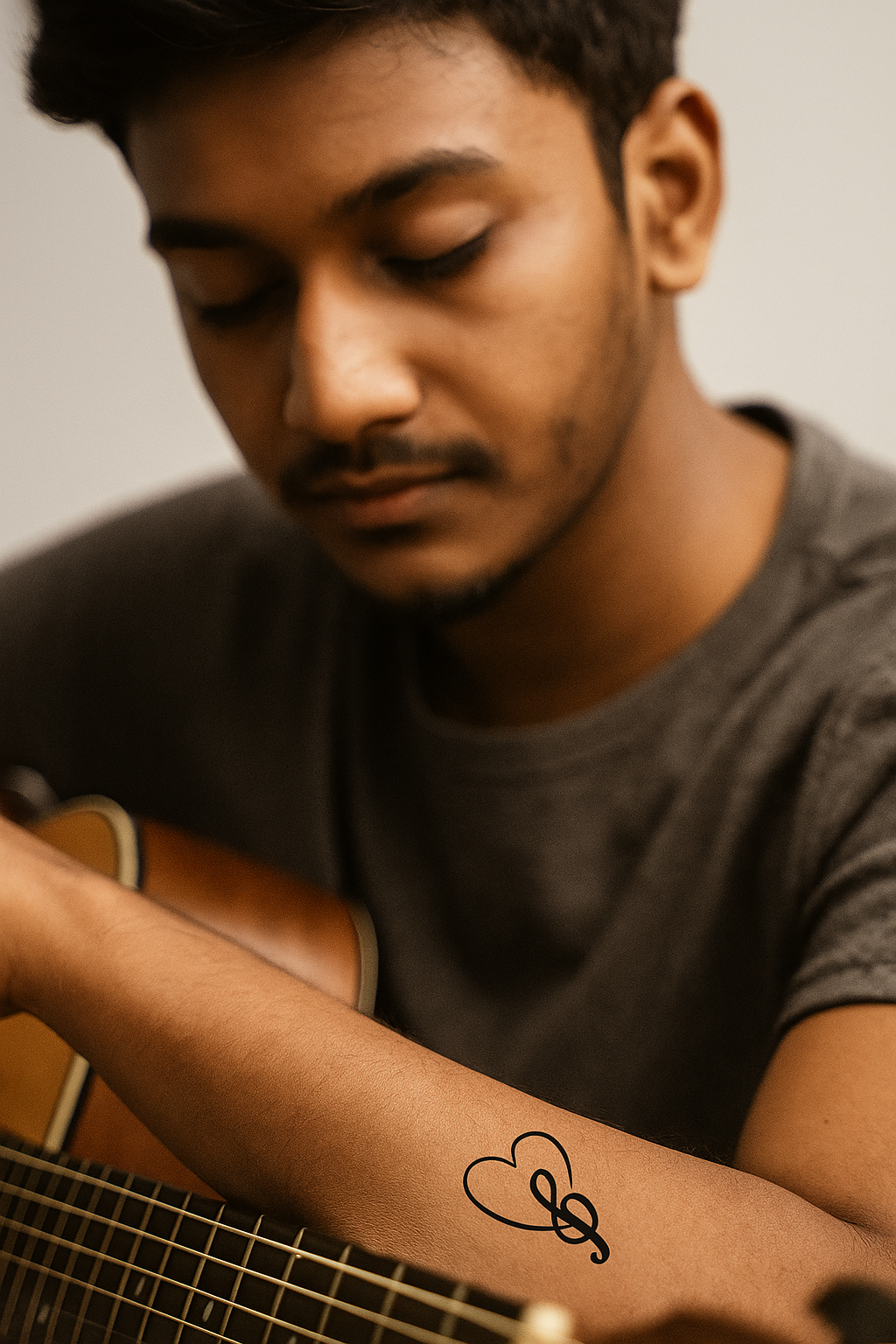 Design Style: Minimalist line art This beautiful design combines a looping heart with a graceful treble clef. It is a symbol of a deep and passionate love for music, representing the harmony and rhythm that music brings to one's life. This tattoo is perfect for musicians or anyone for whom music is a fundamental part of their soul.